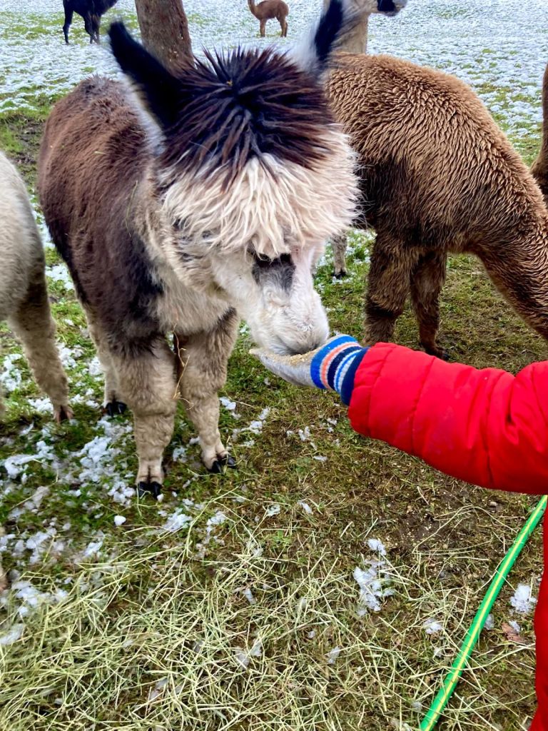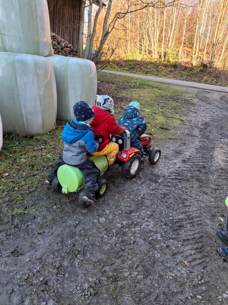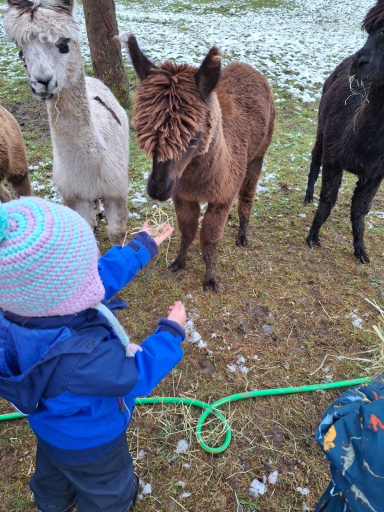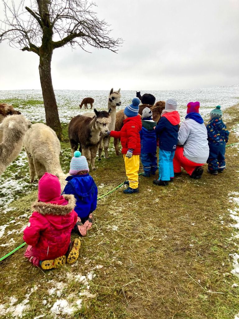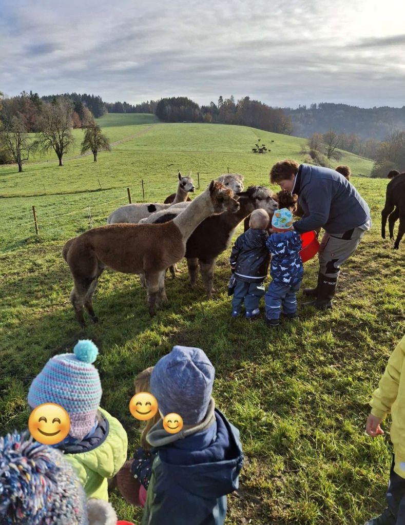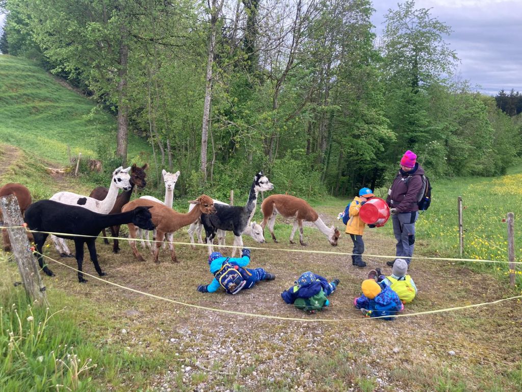 Mit anderen Kindern über die grosse Wiese rennen, ein Spaziergang durch den Wald oder über die geernteten Felder machen, sich in der Matschküche verweilen, im Heu spielen, die Alpakas und Rinder füttern oder ein Feuer machen.