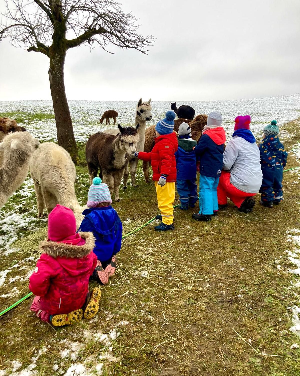 Mit anderen Kindern über die grosse Wiese rennen, ein Spaziergang durch den Wald oder über die geernteten Felder machen, sich in der Matschküche verweilen, im Heu spielen, die Alpakas und Rinder füttern oder ein Feuer machen.