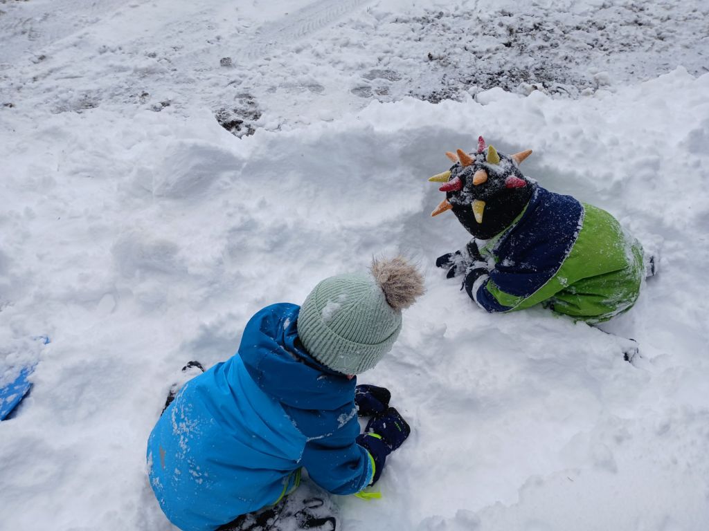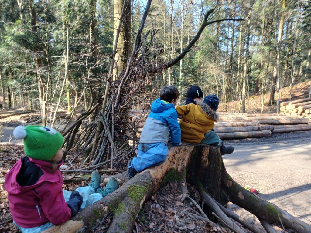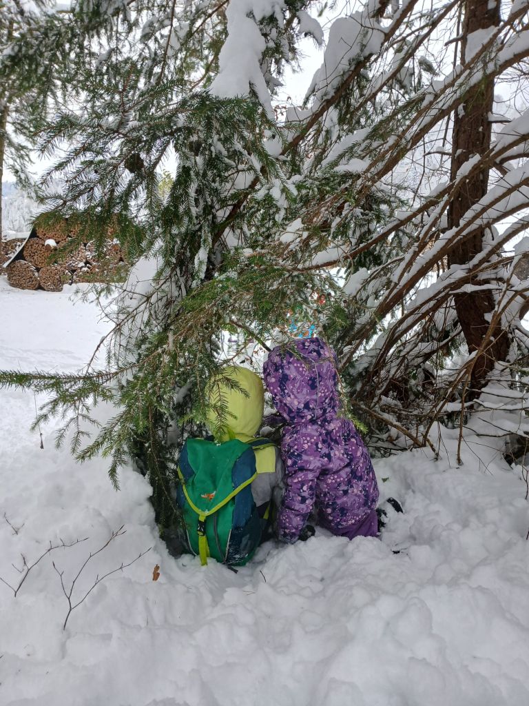 Im Winter sind warme Kleider das A und O für einen Aufenthalt im Wald. Wenn das Kind friert, verliert es schnell die Freude am Spielen und draussen sein. Bewährt hat sich der Zwiebellook, bei dem mehrere, leichte Schichten unter der warmen oder wasserdichten Jacke oder dem Schneeanzug übereinander angezogen werden. Zwischen den einzelnen Kleidungsstücken entstehen Luftkammern, die sich durch die Körperwärme erwärmen und die Kinder warm halten. Die Investition von guten Schuhen lohnt sich!